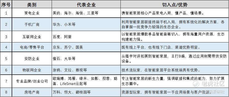 有攜核心產品入局的家電企業,也有擁有用戶流量的電商平臺;有充當聯結終端的手機廠商,也有超強技術生態能力的互聯網巨頭;有由安防業務拓展而來的安防企業,也有專業的技術流物聯網企業;有資源型的房地產商,也有隻專注全屋智能的創業公司……