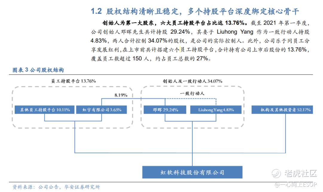 上市前,虹軟就已經搭建了六個員工持股平臺,員工通過間接持股的方式,持有了企業13.76%的股份,持股人數佔全員總數的27%。