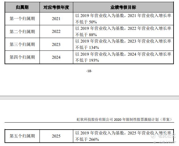 計劃中,虹軟科技安排了5個歸屬期,分別對應考覈2021-2025年5個會計年度,考覈指標均以2019年營業收入爲基數,收入增長率分別不低於50%、88%、134%、193%、266%。