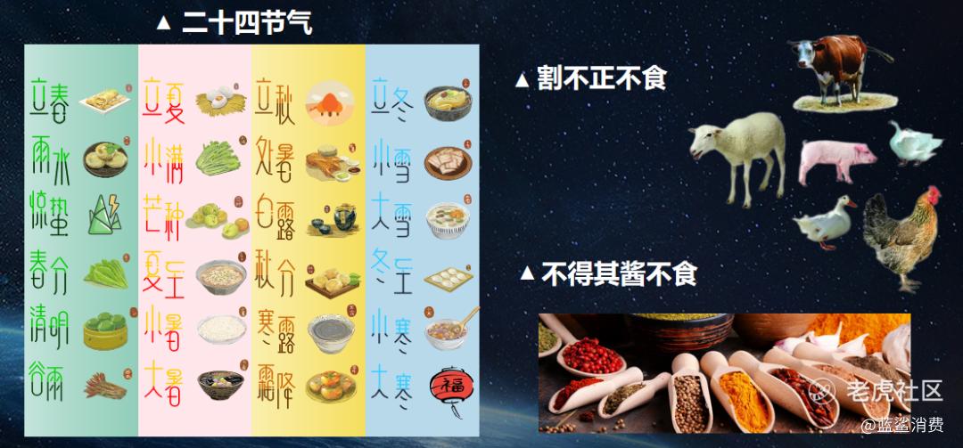 我們認爲是中華文化的二十四節氣。中國節氣裏有七十二個物候,五天一變。舉個例子,最近這些天,馬蘭頭就長不起來,但去年這個時候,馬蘭頭早早就長出來了。中餐有些說法,比如“割不正不食”,意思是把魚膽刺破魚就苦了。比如“不得其醬不食”,我們在家裏燒菜明明要用這個醬料,你偏用那個醬料,先放哪個都是有順序的,醬料放反了也不好吃。這就是我們對二十四節氣的把握以及對產品的敬畏之心。