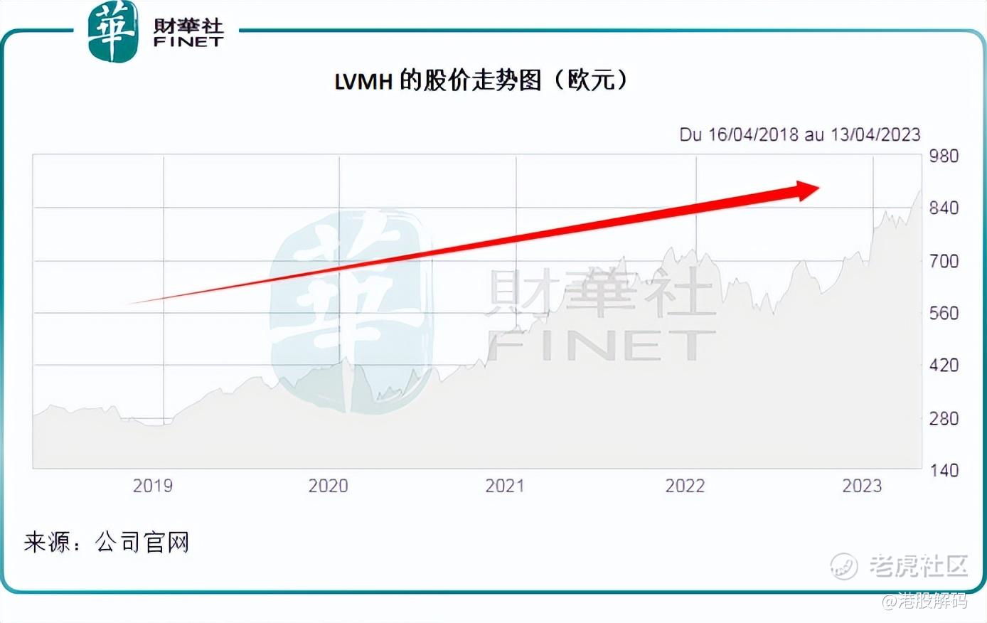 與 $特斯拉(TSLA)$ 大起大落的股價走勢不同,LVMH的股價十分穩固,見下圖,不論是2020年初全球疫情爆發,還是2022年起歐美加息,LVMH的股價都持續向上,並且在公佈2023年第1季創紀錄季度業績後到達紀錄高位。