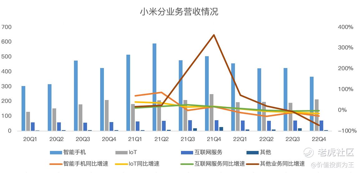 分業務來看,四季度手機收入366.7億,同比下滑27.3%;IOT收入214億,同比下滑14.4%;互聯網服務收入71.7億,同比下滑1.4%;其他收入7.6億,同比暴跌72.7%。