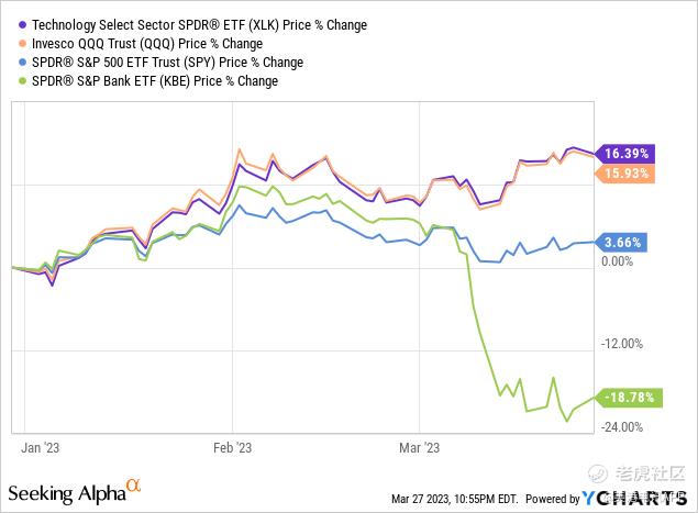 今年, $標普500(.SPX)$ 僅小幅上漲,標普銀行指數則跌了近20%,但科技行業ETF卻漲了16.4%,Invesco QQQ ETF則漲了16%。