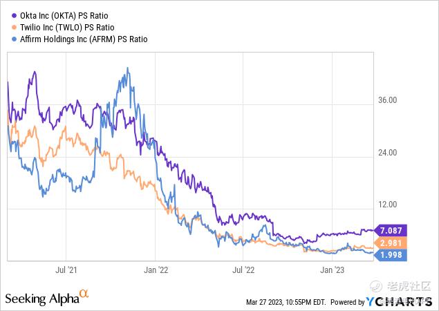 科技股爲何表現優異?首先,科技行業的估值已經被狠狠地重設了。以下爲幾家知名科技公司的市銷率情況: