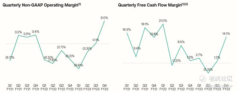 以知名科技巨頭 $賽富時(CRM)$ 爲例,該公司最新業績發佈後,股價飆升。Salesforce裁員近10%,全年利潤指引提高,並在兩年內將non-GAAP營業利潤率提高到30%。Salesforce首席執行官馬克·貝尼奧夫稱自己公司爲“軟件巨頭中表現最好的公司之一”。最重要的是,管理團隊還宣佈將股票回購授權增加至200億美元。當前股價爲遠期每股收益的27倍。