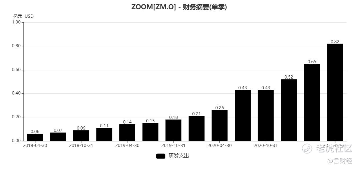 從研發投入來看,Zoom的研發投入一直是比較小的,這也是被投資者擔憂最多的地方,投資者會認爲Zoom的技術壁壘並不高。作爲對比,我們取與Zoom市值相近的另外一家雲計算龍頭ServiceNow的研發來看。