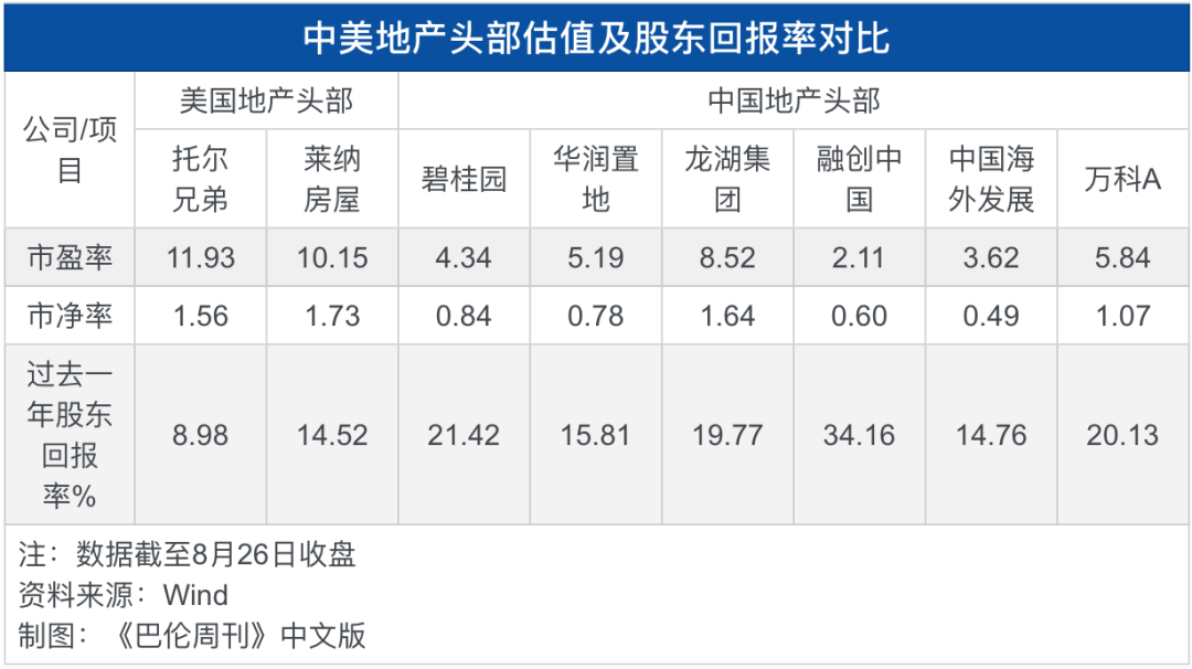同時,對比中美房企可以明顯看到,美國房企的估值明顯高於中國房地產企業。
