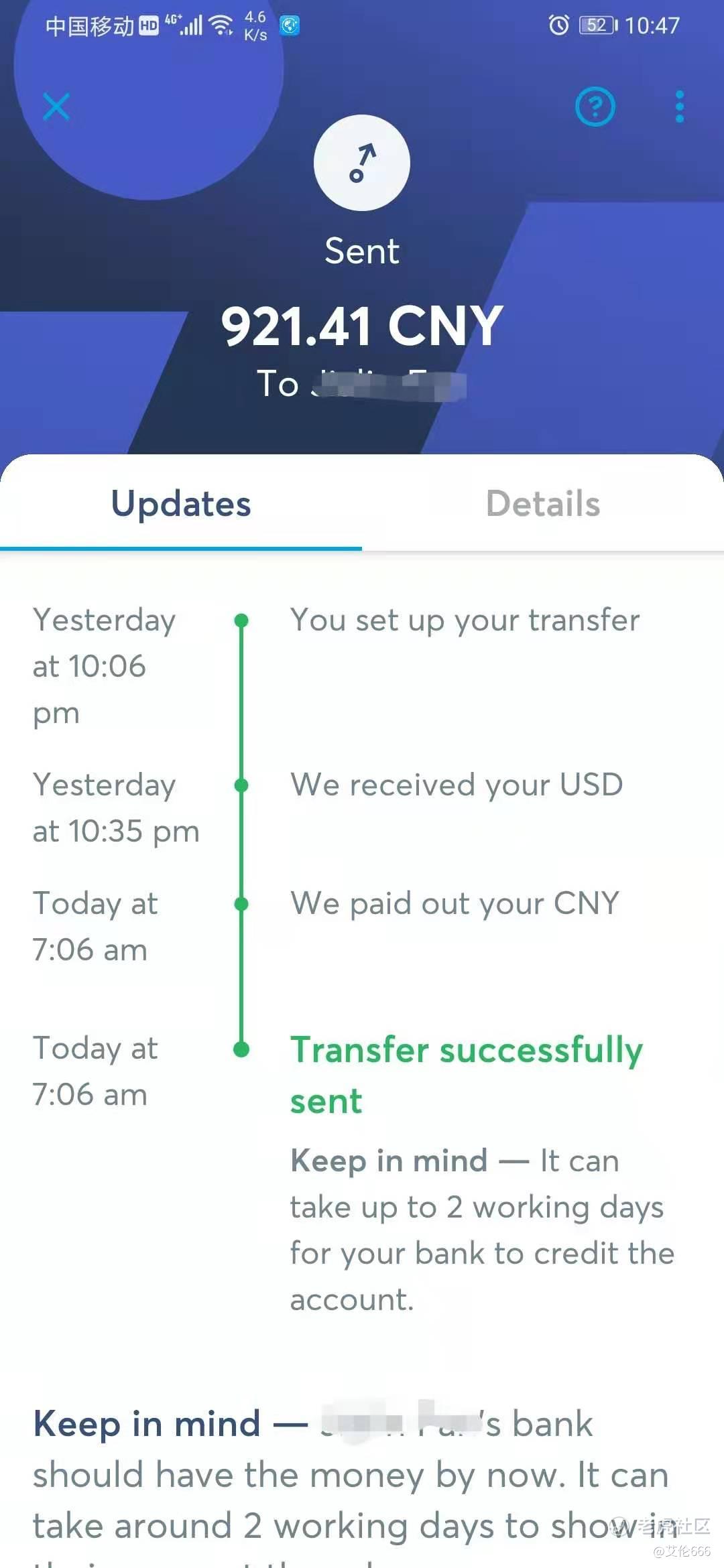 8、至此轉賬完成,後續就是等待資金自動完成轉賬。每一步都會有郵件發送通知你。當收到郵件說Wise已轉賬完成,去查詢一下自己的銀行賬戶即可