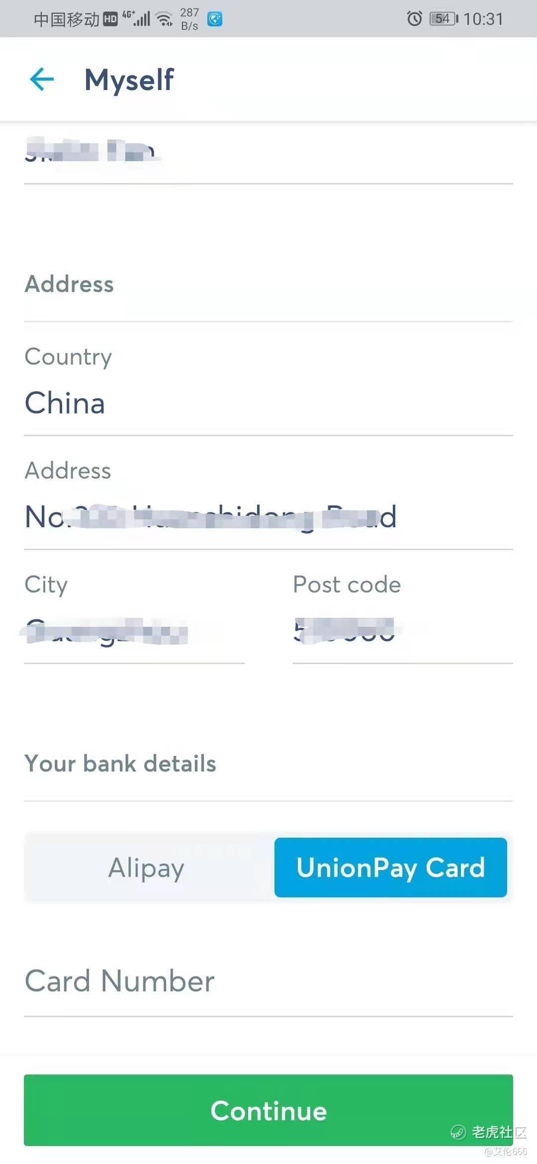 4、點擊Myself(自己)。如果之前沒有錄入過自己的信息,需要在這一步錄入,主要是填你的名字和地址郵編(注意,必須跟你中國銀行卡的信息一致,例如張三丰 應該填寫成 Sanfeng Zhang,地址用英文填寫)。然後點擊Unionpay輸入你的銀行卡卡號(或者點擊Alipay輸入綁定支付寶的手機號)