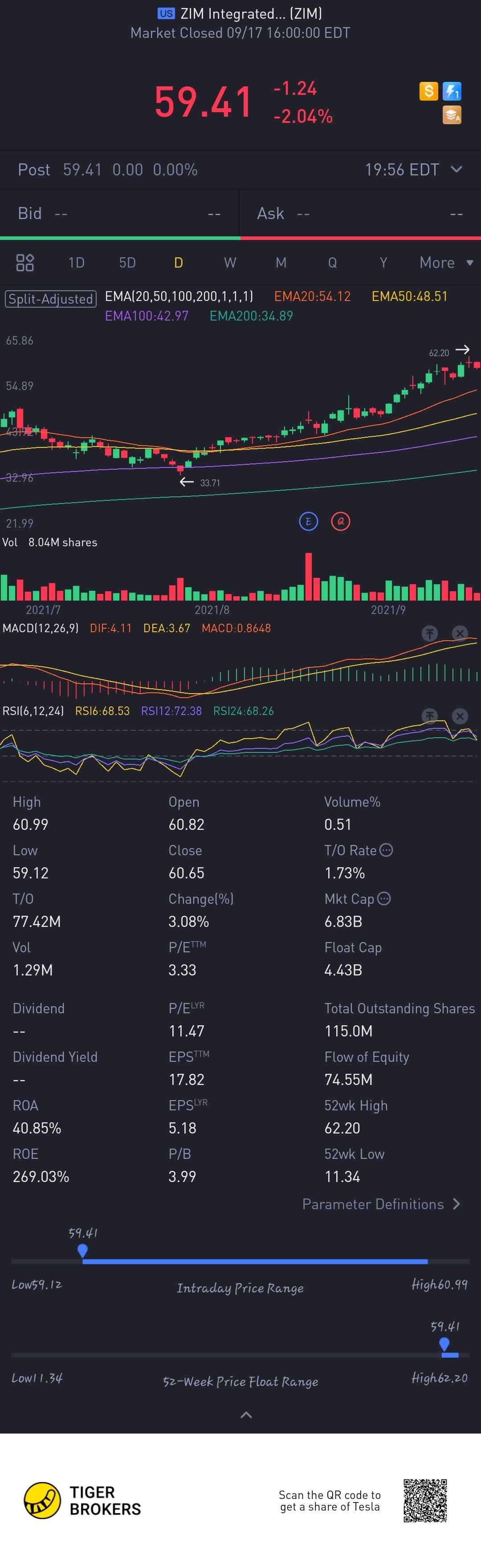 $ZIM Integrated Shipping Services Ltd.(ZIM)$Looking for a pullback to the 20 day ema or evem better, the 50 day ema.