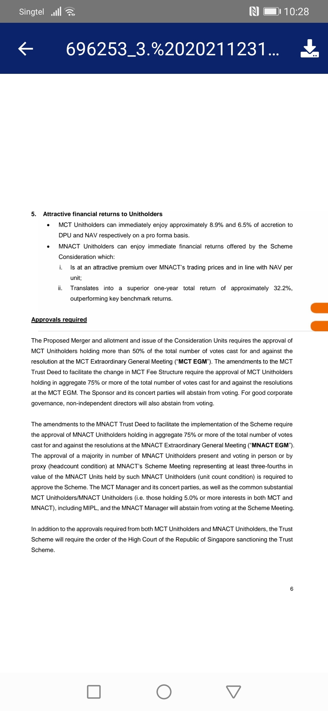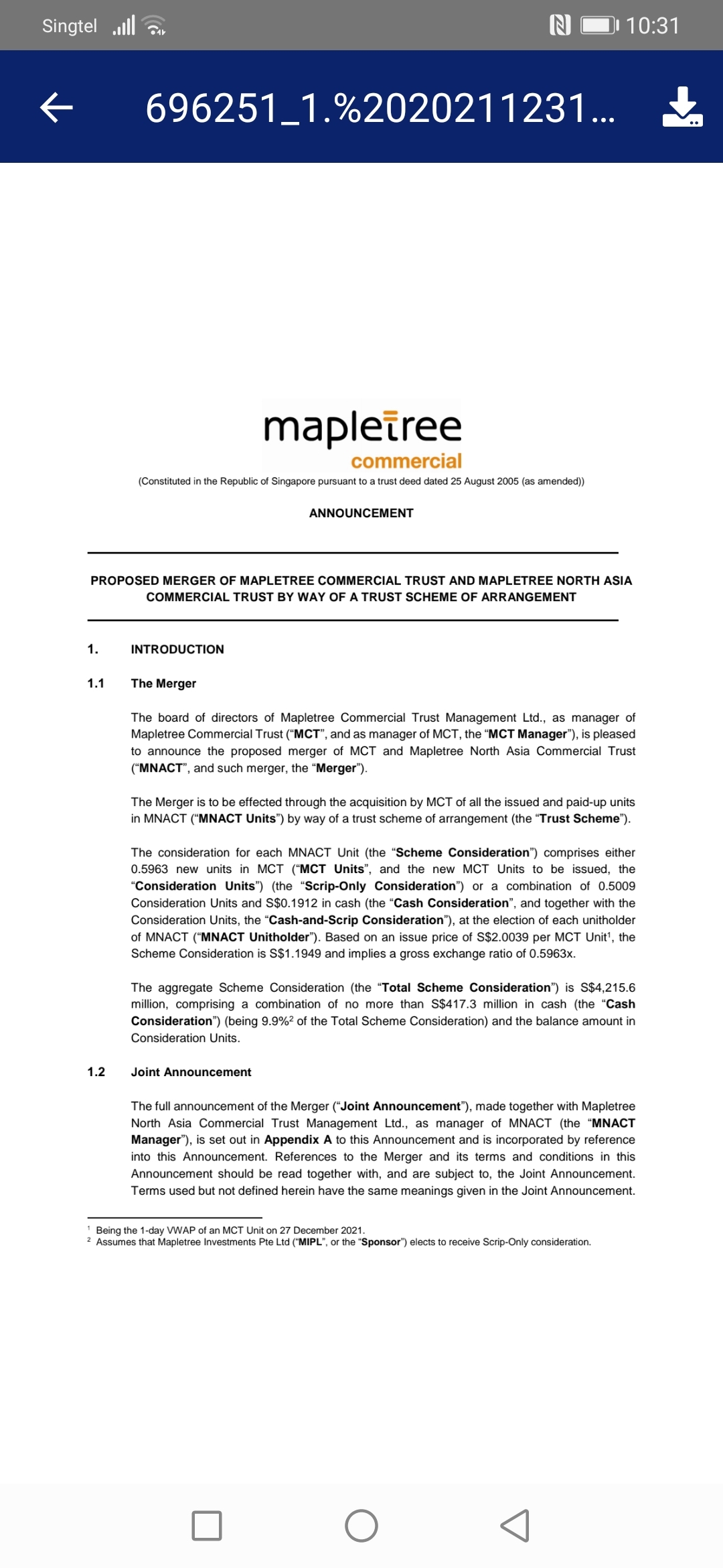 $MAPLETREE COMMERCIAL TRUST(N2IU.SI)$ Why is the price falling after the merger was announced? Isn't it suppose to benefit both parties [Thinking]