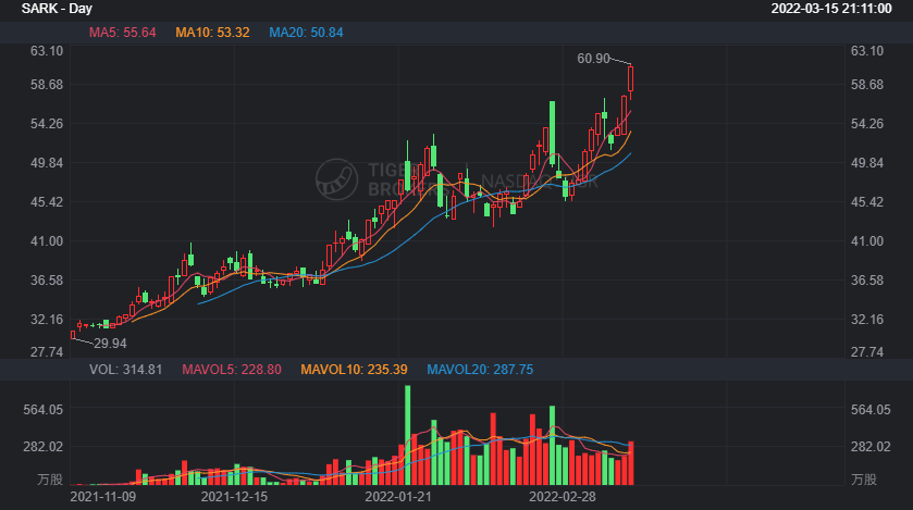 What this article will introduce is the reverse ETF of ARKK$Tuttle Capital Short Innovation ETF(SARK)$. The SARK code is easy to understand, and S stands for short. Since it was launched and listed in November last year, it has doubled its achievements yesterday.