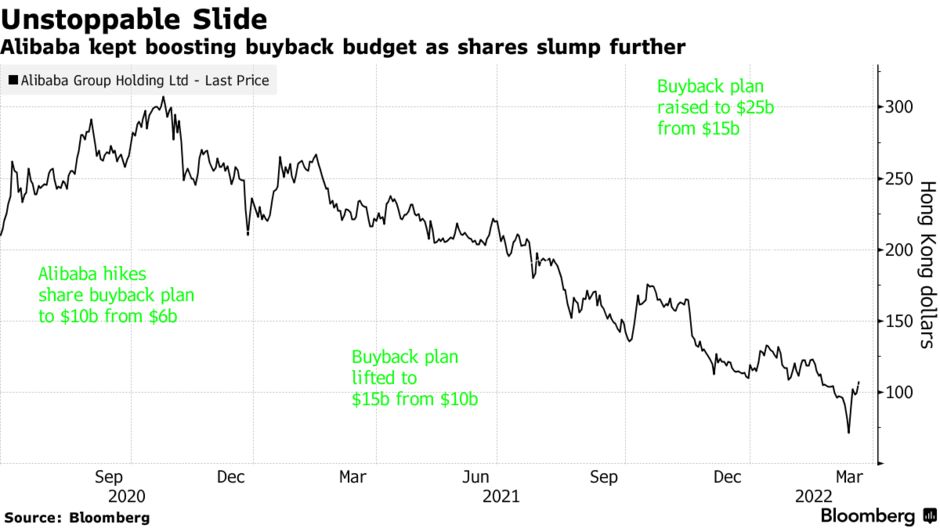 Based on previous two shares buy back of 4bil and 5bil, it's given a boost to $Alibaba(BABA)$ share price, but only short-term and then downtrend resumed. See graph from Bloomberg below. Remained to be seen if this latest 10bil buy back, being largest coupled with likely ending of regulatory crackdown would be enough catalyst to reverse the downtrend.