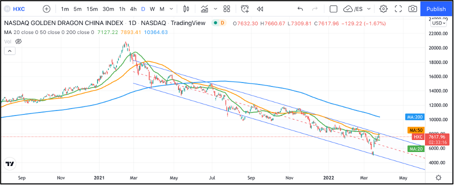 Chinese concept stock as sector using Golden Dragon China Index HXC as proxy, price is just near top of a long downtrend channel since crackdown Mar 2021 on Daily chart (see below). If price could break out of channel and aim for 200MA (blue trend line) then downtrend would reverse and rebound would be long-term. For now, outlook is unclear, need to be patient, see how price action develops over next few weeks.