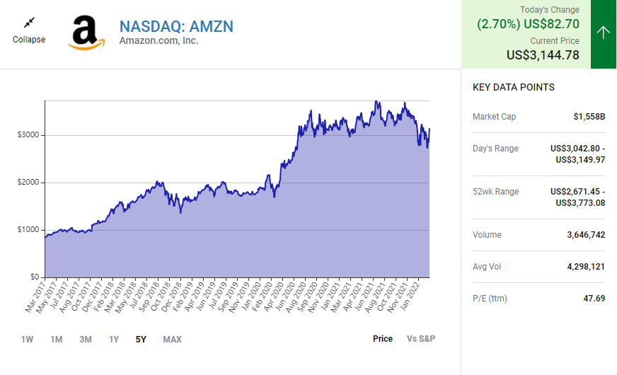 While the stock has fallen recently with the broader market, it has outperformed the Nasdaq Composite index. At the time of writing, Amazon's stock price is down 12.5%, better than the 17.8% fall in the Nasdaq. This outperformance suggests strong underlying demand from investors, which could send Amazon's share price off to the races when the next bull market begins.