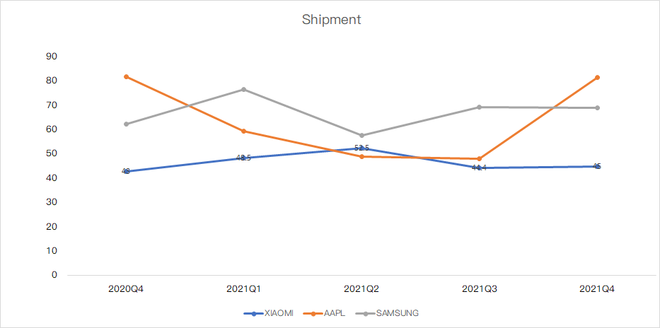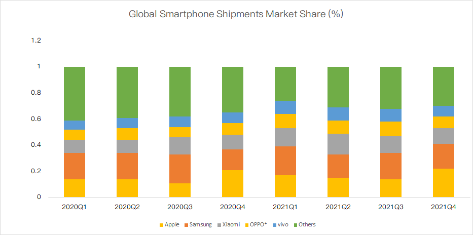Despite this, Xiaomi resisted the pressure in the fourth quarter. Couterpoint data shows that Xiaomi mobile phone shipments in the fourth quarter of 2021 were 45 million units, a year-on-year increase of 4.6%; Xiaomi's market share reached 12%, ranking third in the world (11% in the fourth quarter of 2020).