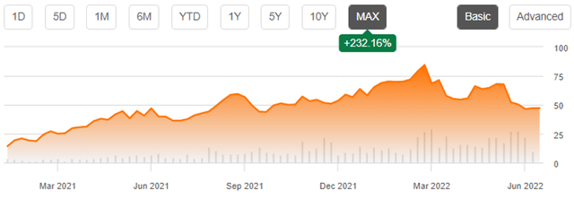ZIM is currently trading at an EV/NTM Revenue of 0.41x and NTM P/E of 1.30x, lower than its 1Y mean of 0.72x and 2.24x, respectively. The stock is also trading at $47.10, down 48.3% from its 52 weeks high of $91.23, though at a premium of 39.7% from its 52 weeks low of $33.71. Nonetheless, despite the recent correction and bearish market sentiment, it is apparent that ZIM has also performed well since its IPO, with a price appreciation of 232.16% and a 1Y price total return of 49.1%.