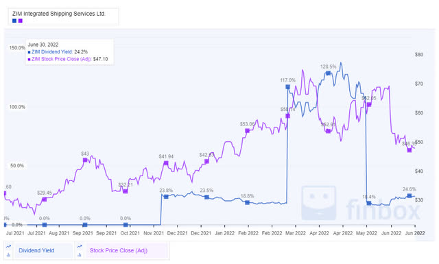 ZIM 1Y Share Price (adj) and Dividend Yield