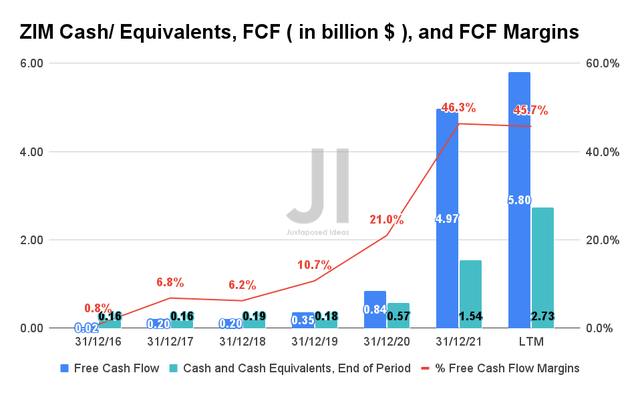 These have directly contributed to ZIM's robust generation in Free Cash Flow (FCF) of $5.8B with FCF margins of 45.7% in the LTM, representing an exceptional increase of 1657.1% and 35 percentage points from FY2019 levels. As a result, it is evident that the company's war chest of cash and equivalents has also grown to an outstanding sum of $2.73B in the LTM, representing tremendous growth of 1516.6% from FY2019 levels.