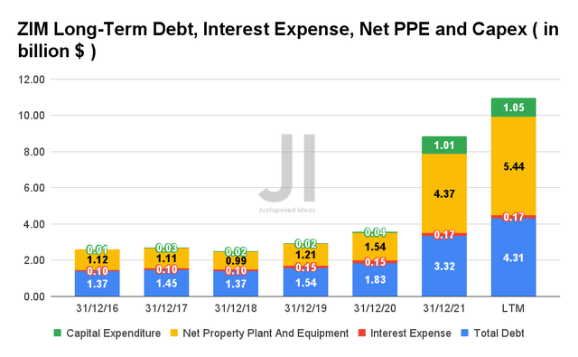 ZIM Long-Term Debt, Interest Expense, Net PPE, and Capex (S&P Capital IQ)
