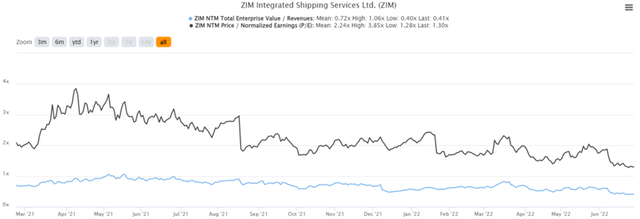 ZIM 1Y EV/Revenue and P/E Valuations (S&P Capital IQ)