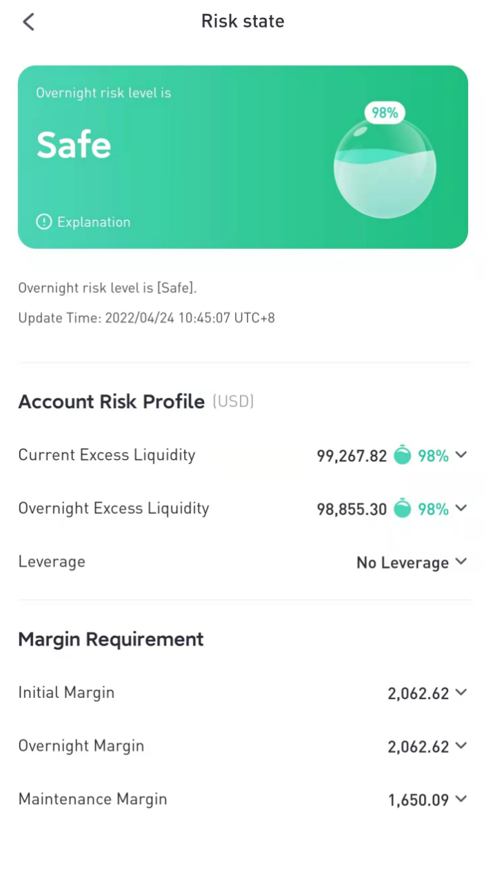 About 10 minutes before the close of each trading day, the broker will conduct overnight excess liquidity on the account positions. At this time, the overnight excess liquidity value needs to be greater than 0, otherwise some positions will be liquidated before the close.