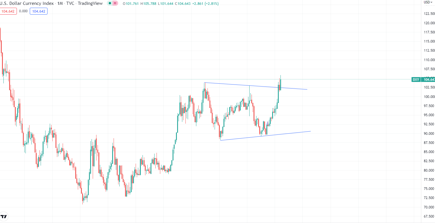However, despite the opportunity to kick interest rates, the overall market pressure is still obvious. The US dollar index, one of the important indicators we suggest to pay attention to, set a new high last week, and the current monthly level is also bullish. At present, there is still more than a week's trading time before the closing of the monthly line.
