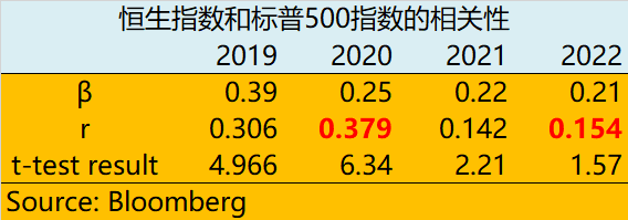 From the perspective of correlation, from 2019 to 2020, we obviously benefited from the prosperity of the global secondary market. The correlation between Hang Seng Index and S&P 500 Index exceeded 0.3, but in 2021 and 2022,The correlation dropped by half to 0.15. On the one hand, the Hang Seng Index failed to keep up with the increase of S&P in 2021; On the other hand, it failed to fully echo the decline since 2022.
