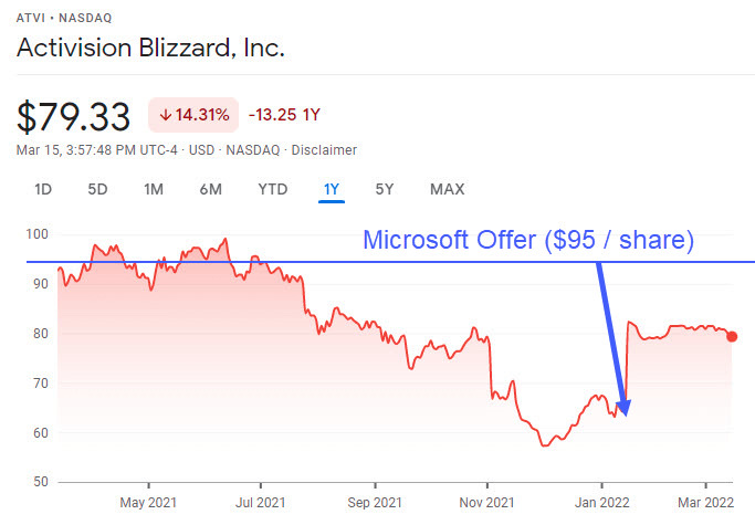 The spread on this deal is large because there are perceived regulatory risks to this deal and there is a chance that the Federal Trade Commission (FTC) might attempt to block the Activision Blizzard deal for anti-competitive reasons.