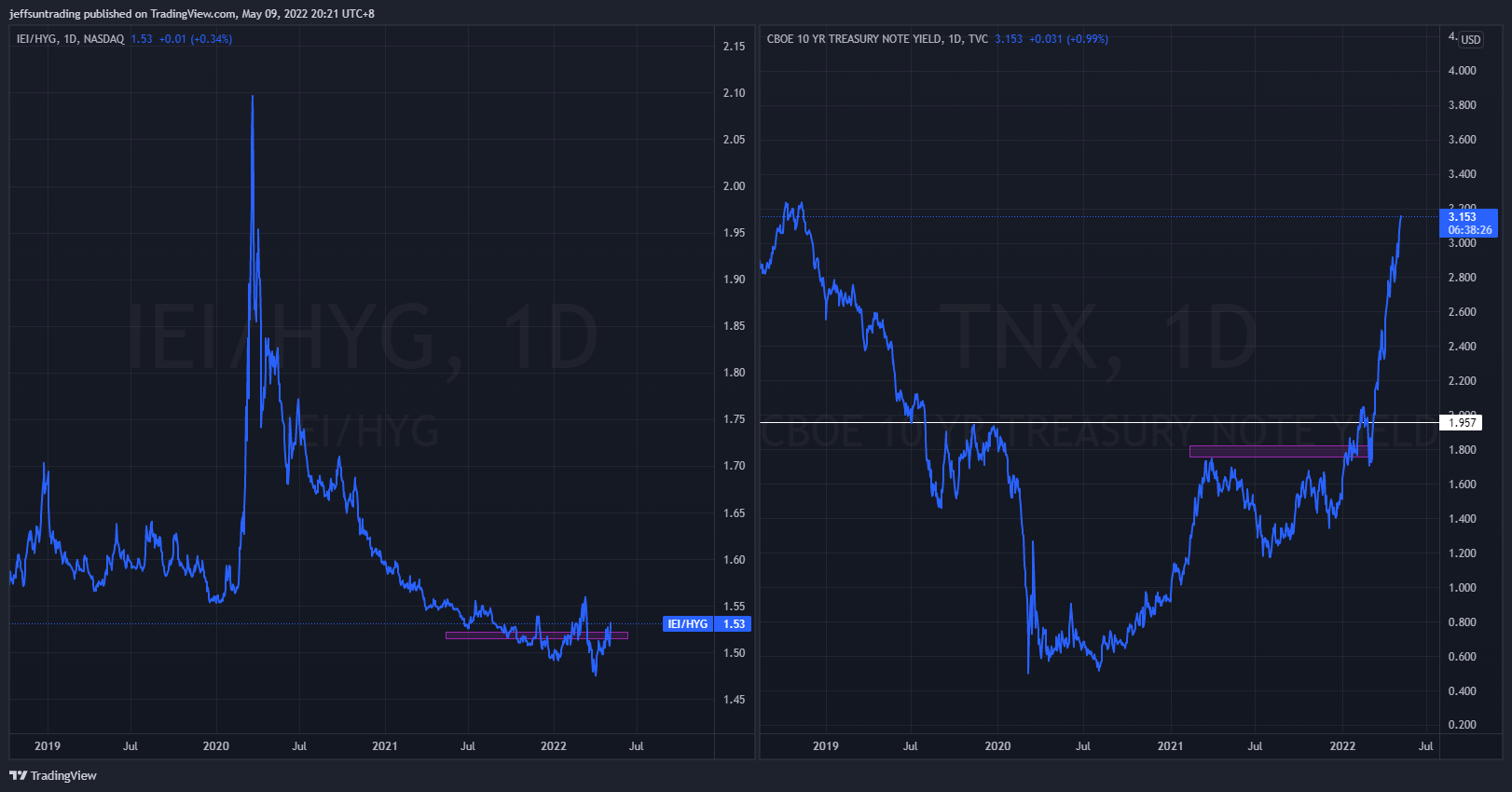 $IEI/$HYG (Credit Spread) – $TNX (10YR Treasury Yield) – Yield Nearing 4 Years High