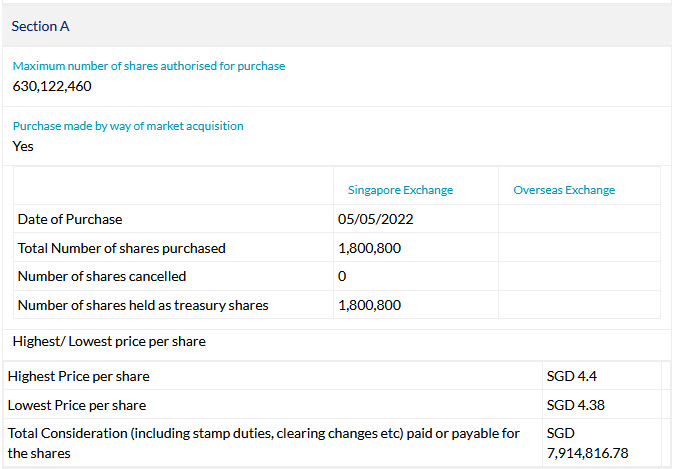 Yesterday they spent SGD16,035,730.78 for a total number of 3,626,600 shares purchased. The maximum number of shares authorised for purchase is 630,122,460 shares, and the cumulative number of shares purchased to date by way of market acquisition is 5,427,400 (from the date on which share buy-back mandate is obtained).