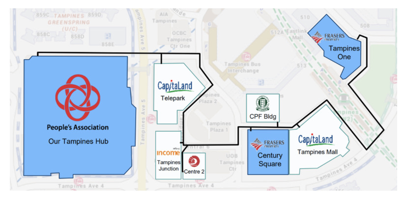 The initial plan drawn up by SP Group and state investor Temasek was to include 6 other buildings at the Tampines regional centre. They are UOB Tampines Centre, OCBC Tampines Centre One, NTUC Income Tampines Point, 7 and 9 Tampines Grande, Tampines Plaza 1 and Tampines Plaza 2.