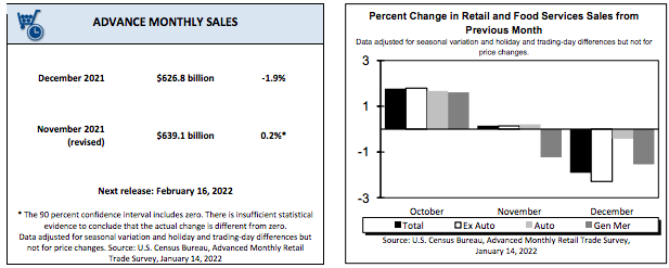 US retail sales sank 1.9% mom in December, the biggest decline since February of 2021, Advance estimates of U.S. retail and food services sales for December 2021, were $626.8 billion, adecrease of 1.9 percentfrom the previous month, but 16.9 percent above December 2020.