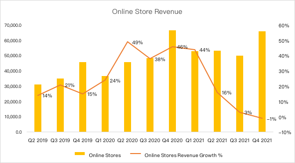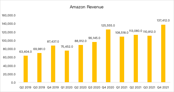 Amazon’s online store revenue sales decreased 1% to $66.07 billion, compared with $66.45 billion in 2020. Third-Party Seller Services net sales were $30.32 billion, up 11% year over year. Net sales from subscription services were $8.123 billion, up 15% year-over-year; net sales from Physical Stores were $4.688 billion, up 17% year-over-year.The reason why Amazon's growth rate has declined is mainly due to the impact of the macro economy. After the U.S. Department of Commerce released December retail sales data, many analysts actually lowered Amazon's fourth-quarter revenue forecast to $137.6 billion from $137.8 billion in mid-December.