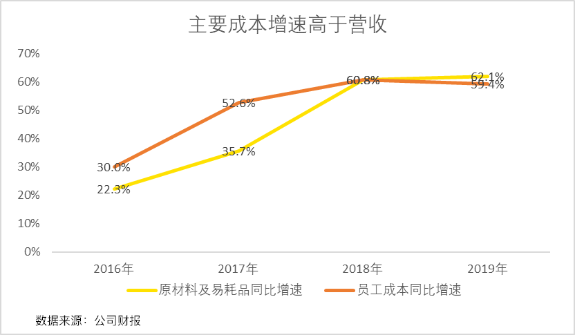 淨利潤增速略低於營收增速的主要原因是原材料和員工成本增速較高,這兩項成本佔營收的比重達到72.4%。其中,原材料及易耗品增速62.1%,員工成本增速59.4%,皆高於56.5%的營收增速。