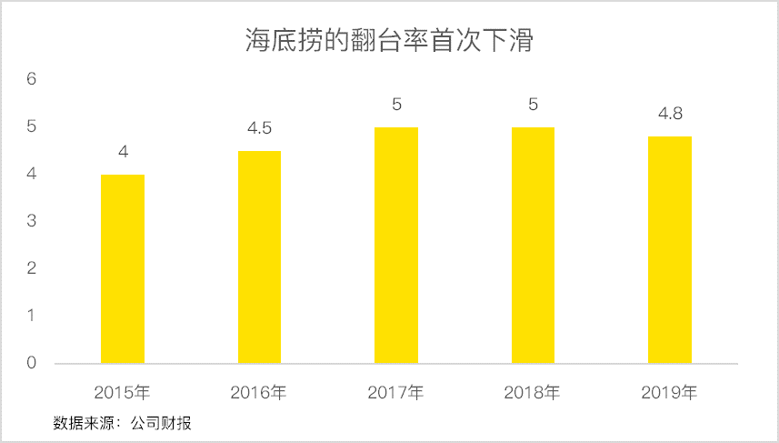 在2019年年報中,海底撈的翻檯率由去年的5.0降到了4.8,這是海底撈公佈的財務數據以來,首次出現下滑。