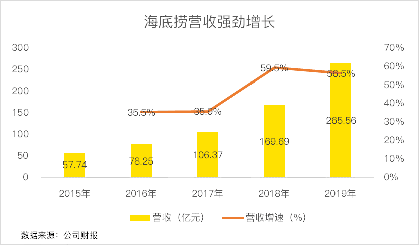 在新增餐廳大增的刺激下,海底撈2019年營收265.56億元,同比增長56.5%,淨利潤達到23.45億,同比增速42.5%。