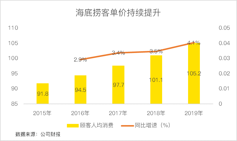 另一方面,海底撈的客單價略有提升,人均消費從2018年的101.1增長4.1%達到105.2元,歷史上看,海底撈的客單價一直在提升。