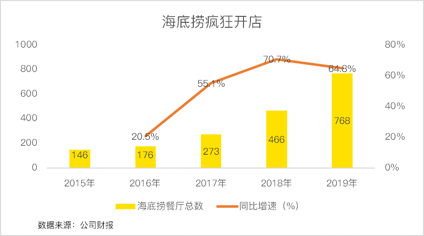 在2019年,海底撈新開門店308家,門店總數達到768家,較2018年增長64.8%!