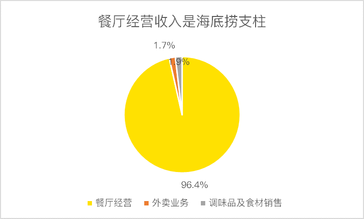 海底撈的營收結構較爲簡單,收入的主要來源分爲3部分,分別是餐廳經營收入、外賣業務、調味品及食材銷售,其中,餐廳經營收入佔總營收的比重達到了96.4%。