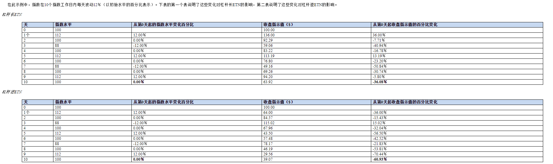 如下圖, 指數在10個指數工作日內每天波動12%(以初始水平的百分比表示)。 下表的第一個表說明了這些變化對槓桿長ETN的影響,第二表說明了這些變化對槓桿逆ETN的影響。可以看到,第10天,指數還是100,而無論做多,還是做空,均是虧損的,而且虧損巨大。