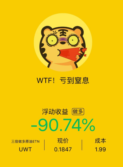 - 虎大大大爷·2020-04-15前几天买了国内的账户原油,还以为找到了可以长期持有的,银行说这个是理财产品,很稳,持仓半年损耗才一个点。结果昨天转期三十多个点没了。银行说他们也没遇到过。心累,抄原油的底怎么这么难。LikeReport