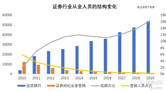 券商早早就爲轉型買方投顧而做準備,這幾年來紛紛着力打造投顧團隊。自 2010 年以來,證券行業從業人員的結構發生了顯著變化,其中投資顧問數量由 2010 年的3882人增加至2019 年末的 5.37 萬人,人員比重由 1.86%大幅增加至16.3%;而營銷人員數量由 2010 年的 1.23 萬人減少至的890人,人員比重由 5.89%降至僅 0.27%。人員結構翻天覆地的變化也印證了行業以費代傭、以賣方銷售爲導向向買方投顧業務發展的財富管理轉型趨勢。