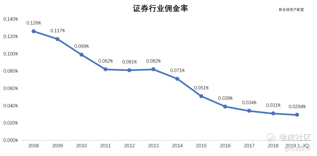 券商傳統經紀業務同質化以及價格戰,促使國內佣金率不斷下行。券商傳統的經紀業務主要是提供基礎的通道服務,各大券商之間差別不大。自2013年佣金自由化以來,爲了爭搶客源,各家券商紛紛出臺優惠政策,券業的佣金率快速下滑,由 2013年的0.082%降至 2018年的0.031%,2019年前三季度行業平均佣金率0.0294%,較上半年萬分之 3.01持續小幅下滑,行業佣金率首次跌破萬三,而萬2.5被視爲全行業的“紅線”。