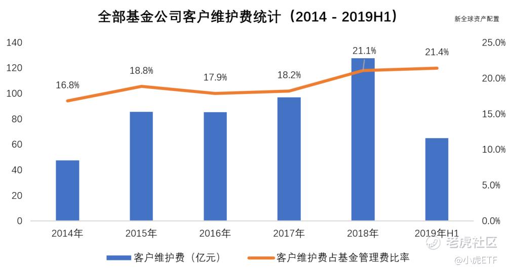 基金公司的產品銷售高度依賴第三方渠道。基金公司的產品銷售渠道有自營的直銷平臺和第三方代銷平臺(銀行、券商、互聯網機構等)。部分優勢代銷平臺憑藉強大的客戶或流量資源,具有極高的議價能力,除申購費、銷售服務費等傳統渠道費用外,還參與管理費的分成即我們通常所說的尾隨佣金。據統計,2018 年全市場基金公司支付給第三方渠道的客戶維護費高達 127.57億元,佔全部管理費收入的 21.0%;2019年上半年客戶維護費64.82億元,佔全部管理費收入的21.4%。