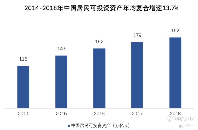 中國居民可投資資產規模從2014年115萬億元增長到2018年192萬億元,年均複合增速達13.7%。居民財富的持續積累,以及對自身財富管理關注程度的提升,帶動財富管理市場的需求。