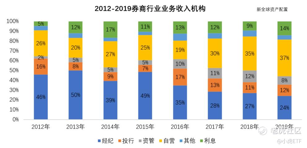隨着佣金率的下滑,經紀業務在券商的總營收佔比也是呈下降趨勢。由 2013 年的50%下降至 2019年前三季度的 24%,雖然仍是第二大收入來源,但其收入彈性與貢獻度已不可同日而語。