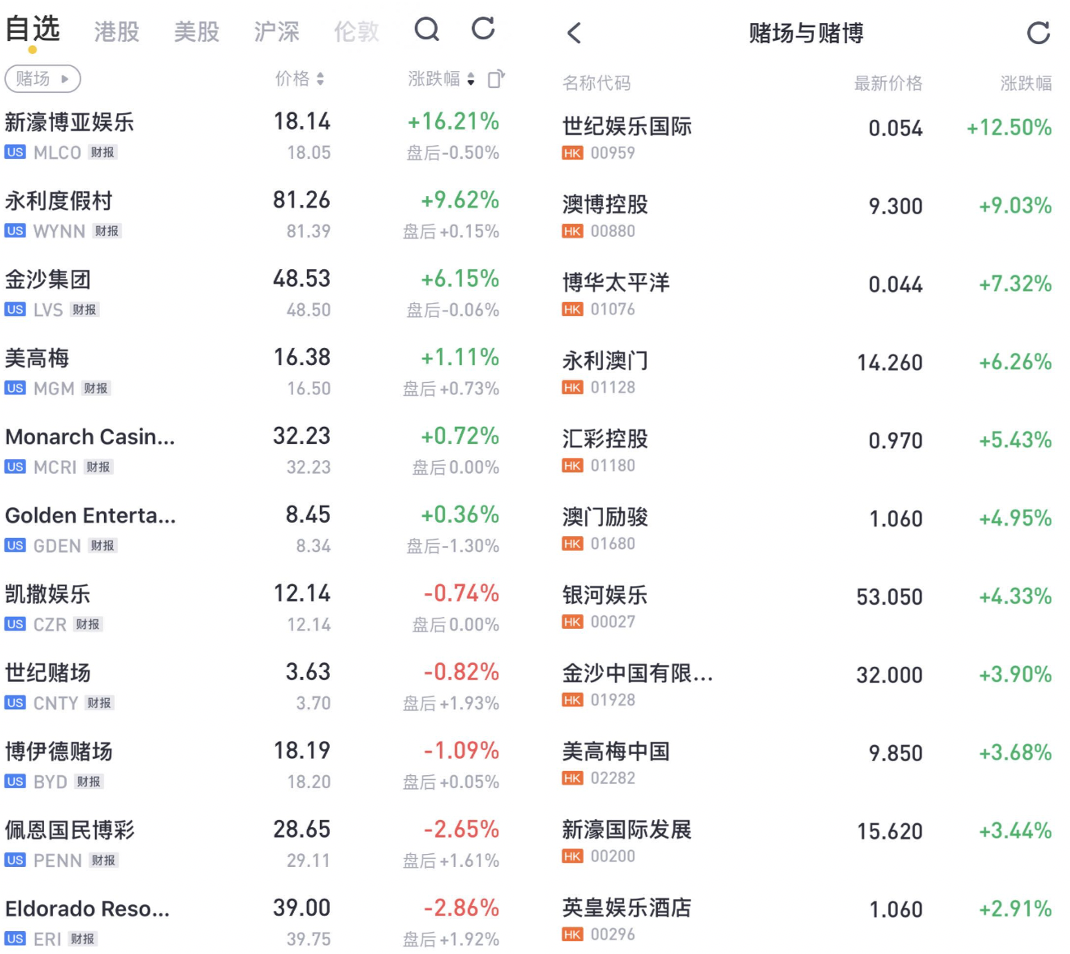 這輪博彩股的上漲在週一美股就有所體現,$新濠博亞娛樂(MLCO)$ 大漲16.2%,$永利度假村(WYNN)$ 大漲9.62%,$金沙集團(LVS)$ 大漲6%