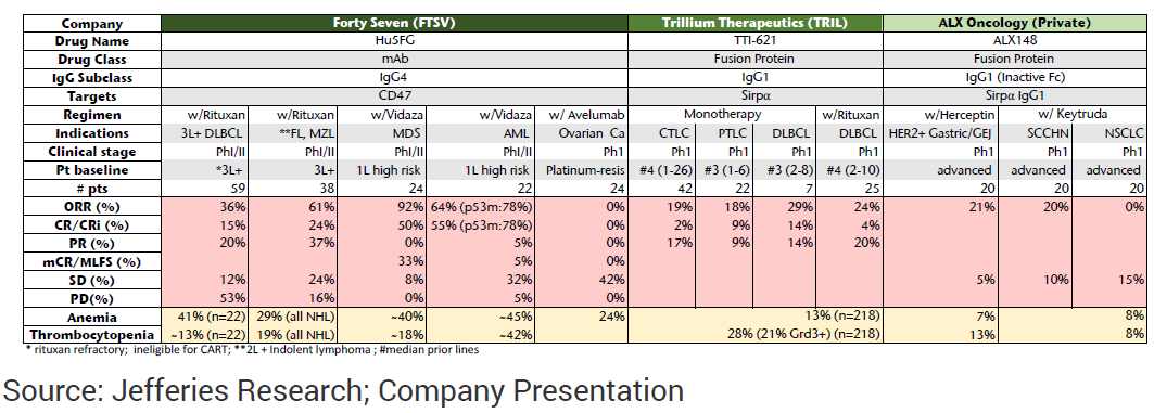 CD47-Sirpα Space is Heating Up with Three Companies Leading the Pack:We screened both public and private companies and summarized >20 CD47- or Sirpα-targeting programs in the space (see our report here). Three companies have reported encouraging clinical progress (Exhibit 1). FTSV is a clear leader and provided the most validation data for CD47-targeting drug thesis. FTSV’s Magrolimab sets high bar in 1L MDS and AML and exhibited better than SoC response in 3L DLBCL. However, it has not seen similarly impressive data in solid tumor settings (DCR: 42%; mPFS: 2.1 mos in 24 platinumresistant ovarian cancer pts, ASCO-SITC ’20). TRIL’s TTI-621, a Sirpα-IgG1 fusion protein, has showed single agent activity in DLBCL, PTCL and CTCL despite small sample size. No severe anemia has been observed, however, TTI-621 is prone to killing platelets, leading to thrombocytopenia. Another candidate, TTI-622, is an IgG4-Sirpα fusion protein, and its reduced effector activity would presumably reduce toxicities. TRIL noted better safety has been observed with TTI-622, which could allow higher dosing to drive improved efficacy. ALX oncology’s ALX148, is a Sirpα fusion protein with inactive Fc domain, thereby requiring combo partner to provide macrophages with Fc-receptor driven 「eatme」 signals. The treatment of ALX148 + Herceptin and + Keytruda combo resulted in responses in HER2+ G/GEJ and SCCHN, respectively. ALX Onc believes that inactive Fc domain would enable higher dose not limited by anemia and other hematological toxicities; however, the drug potency of single agent remains to be determined.
