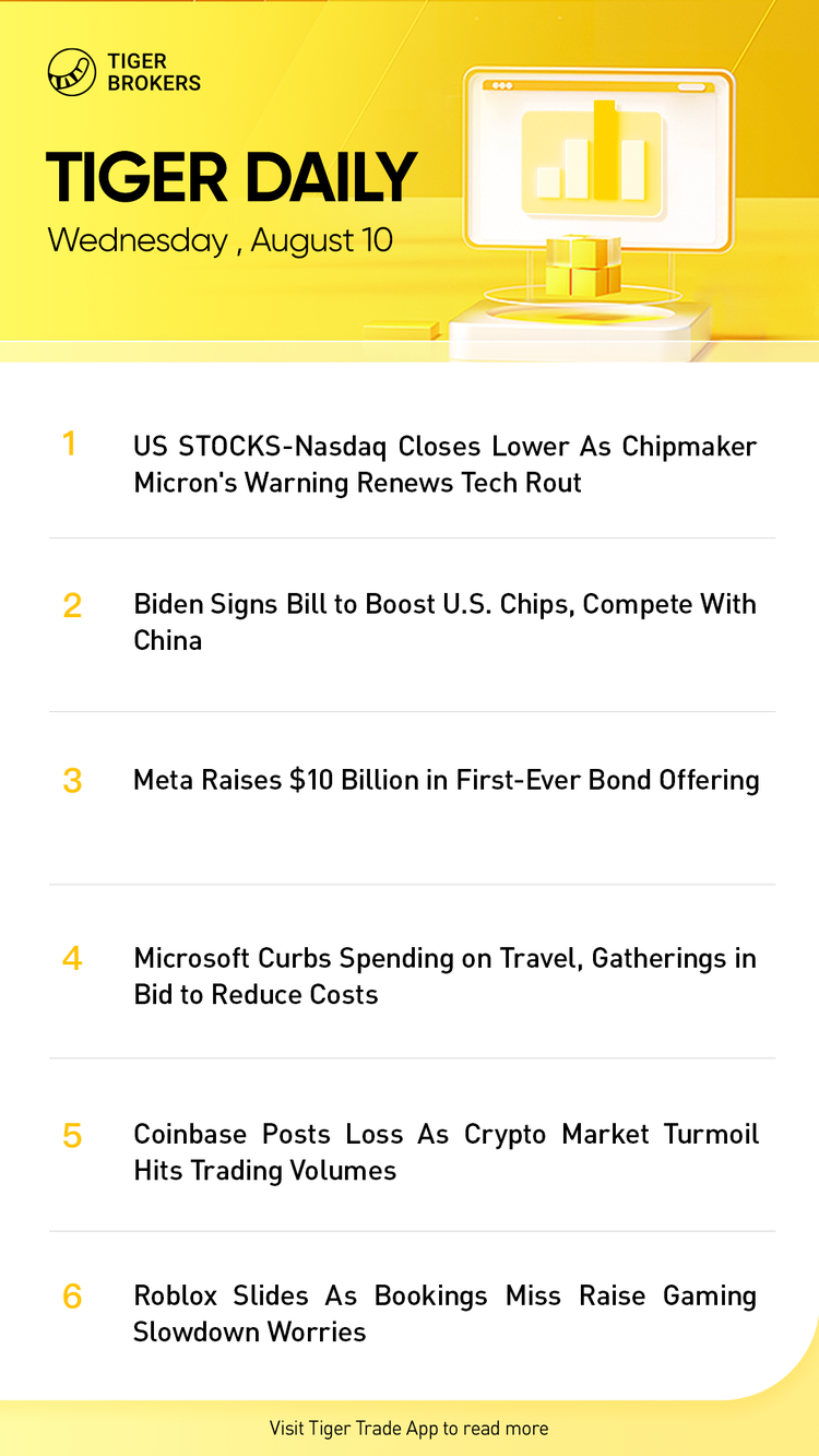 - U.S. stocks extended losses Tuesday as investors assessed earnings and prepared for a key inflation report due out Wednesday.The S&P 500 fell 0.4%, while the Dow Jones Industrial Average ticked down about 0.2%. The tech-heavy Nasdaq Composite tumbled 1.2% as a warning from $Micron Technology(MU)$ weighed on chip and technology stocks.Micron’s announcement comes one day after chip industry peer Nvidia (NVDA)indicated its second-quarter revenue would drop by 19% from the prior quarter as the gaming business more broadly takes a hit from fewer purchases by consumers of discretionary items such as laptops and video game consoles.